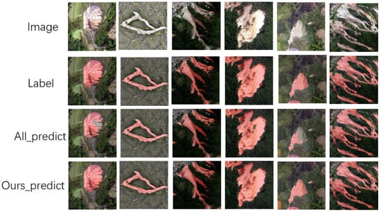 Through the comparison of the above figure, we can feel a significant difference between the whole graph prediction method and the prediction method we propose. Taking the first and fifth columns of the images as an example, there is an obvious lack of landslide area in the visualization results of the whole map prediction, but our prediction method can completely and accurately identify the entire landslide area. The root of this difference lies in how the model is trained and how well it perceives contextual information. Our model is trained on 512 × 512 size images, which enables the model to focus more on detailed information when processing high-resolution images but also leads to insufficient perception of global context information in whole map prediction. Looking further at the pictures in columns 3, 4, and 6, we can see that our prediction method is significantly better than the whole map prediction method in terms of detail processing. Not only does our method accurately identify the overall extent of the landslide area, but it also better captures the subtle structure and edge information within the area, resulting in better detail. This indicates that our prediction method can more effectively balance the relationship between local details and global information when dealing with complex scenarios, to achieve more accurate and reliable prediction results.