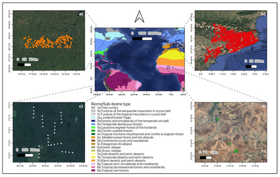 Study areas in the 4 different biomes, represented in the center of the figure and according to the biome/sub-biome classification from [29]. For the cases of Quebec (a) and Catalonia (b), the distribution of all plots is seen. For the cases of Brazil (c) and Burkina Faso and Niger (d), a subset of the plots is zoomed in.