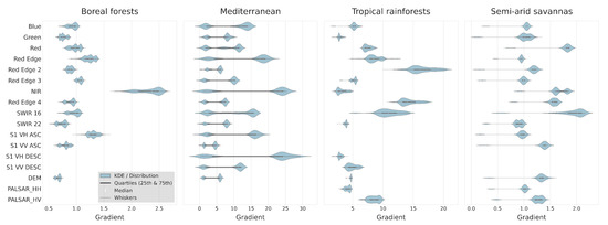 Violin plots showing variable importance from average gradients’ distributions across each biome. Whiskers represent the Q1 − 1.5 IQR and Q3 + 1.5 IQR.