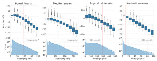 All biomes exhibited a similar pattern of a more accurate fit at low AGBD values—with more representativity of GEDI data points—while the errors got larger at higher AGBD values. In all biomes, the median errors at lower AGBD values were up to 4 orders of magnitude higher in the first bin compared to the last one (Figure 3). For reference, the 90th percentile of the GEDI AGBD data in each biome is 92.21 Mg ha−1 for Quebec, 125.91 Mg ha−1 for Catalonia, 284.81 Mg ha−1 for Brazil and 10.40 Mg ha−1 for Burkina Faso and Niger, as indicated by a vertical red dashed line in Figure 3. The best performance across the range of values was observed for Catalonia, where the drop in observations along the AGBD gradient, despite being high, was well distributed across the territory and better captured by the model. Only the last three bins (245–350 Mg ha−1) show large errors with significant deviation. In terms of relative errors, the clearest decline in performance is seen in the semi-arid areas of Burkina Faso and Niger, where the quantity of data points close to 0 is orders of magnitude higher than the rest of data points, providing a very good fit to the first bin (0–10 Mg ha−1, covering up to 90% of the available data points), but compromising the errors in the rest of the range of values. A similar pattern was observed for Quebec, with the amount of GEDI data points being orders of magnitude higher at approximately 20–40 Mg ha−1 and then quickly dropping. Only a few thousands of points are located over 150 Mg ha−1, limiting the ability of the model to learn these patterns across the territory. Tropical rainforests, on the other hand, presented a more homogeneous distribution of values up to around 250 Mg ha−1, from which point a decline in amount of data points is seen, accompanied by a drop in performance. Above this threshold, errors reach median values over 200 Mg ha−1, suggesting areas where the signal is clearly saturated.