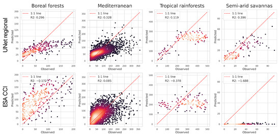 Scatter plots of observed (forest inventory plots) vs predicted values (either ESA CCI or our regional UNet model) illustrate that the UNet estimations exhibit saturation at higher AGBD levels, limiting the model’s ability to predict accurate values beyond a certain threshold (Figure 4). However, predictions beyond GEDI’s 90th percentile for each biome—as indicated in Figure 3—are obtained across the territory, showing the model’s capability to generate predictions throughout the whole AGBD range. On the contrary, ESA CCI has the capability to reach higher values, exhibiting less saturation potentially due to its calibration being done with a wider range of AGBD values (lower panels in Figure 4). However, our model tends to fit the lower end of AGBD values more accurately, with ESA CCI tending to overestimate low AGBD in three out of four biomes. The exception were the semi-arid areas, where ESA CCI consistently predicted much lower values than observed in the inventories, proving incapable of detecting AGBD values over 3 Mg ha−1. Accordingly, R2 values were higher for UNet than for ESA CCI in all the biomes.