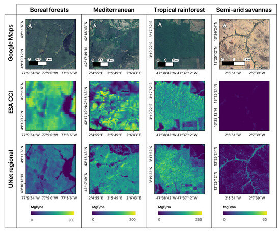 Additionally, to evaluate the performance of the adapted UNet model against an established global biomass product, we used the ESA CCI AGB dataset [14] as a benchmark. This dataset offers global coverage of biomass estimates at a 100-m spatial resolution and provides data for multiple time points, making it the most comparable product to the approach presented in this study, despite its coarser resolution. The ESA CCI data were downloaded and processed to align with the temporal and spatial scales of our study regions. The comparison included both a qualitative and quantitative analysis. Continuous biomass maps from the ESA CCI dataset were compared to those generated by the adapted UNet model in representative areas of the four biomes. Furthermore, errors in the ESA CCI estimates were evaluated using the same inventory plots and validation metrics applied to the adapted UNet model. As the ESA CCI dataset has a coarser resolution than the UNet model estimations, the individual pixel containing the field inventory plot area was used for this comparison. This ensured a direct and consistent comparison of model performance. By assessing both spatial accuracy and quantitative agreement, this benchmark analysis provides insights into the relative strengths and limitations of the adapted UNet model in comparison to a widely used global dataset.