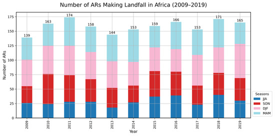 ARtracks data (2009–2019) were processed to capture the spatial and temporal characteristics of AR landfalls. Preprocessing included formatting timestamps, filtering by geographic boundaries, and categorizing events into Northern and Southern Africa. Events were further organized by year and month to enable seasonal and regional comparisons. Landfall points were verified using Python 3.12.3. and the Shapely library (v2.0.2), ensuring spatial accuracy and relevance to Africa.