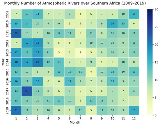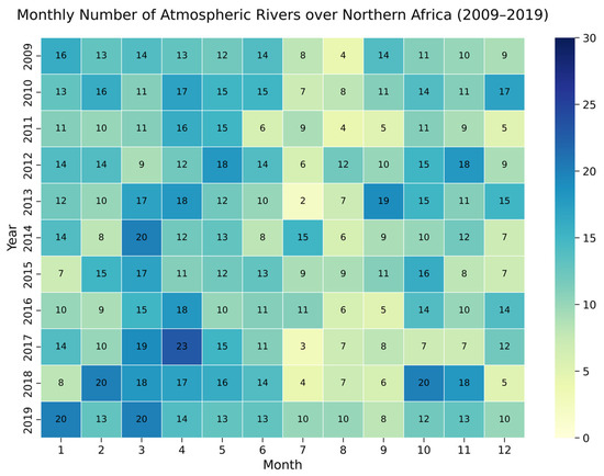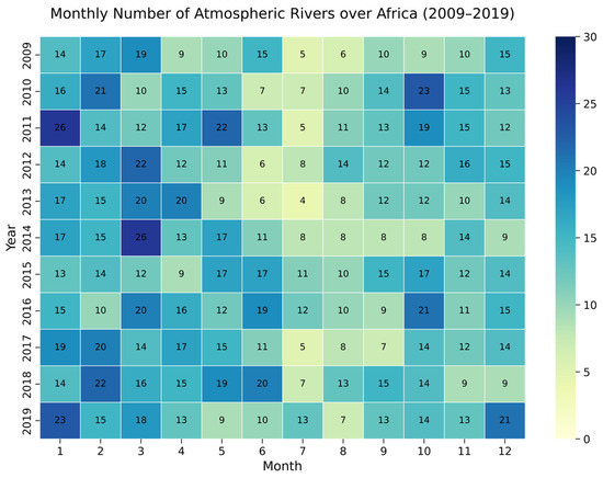 Heatmap showing the monthly number of ARs over Africa (2009–2019).