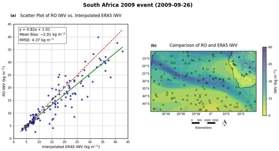 Analysis of the South Africa 2013 event. (a) Scatter Plot of RO versus ERA5 IWV. Blue circles represent individual coincident RO and ERA5 IWV values. The green line shows the linear regression fit, while the red dashed line indicates 1:1 agreement between datasets. (b) IWV from ERA5 (map) and from RO (filled circles).