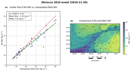Driven by moisture originating over the Red and Mediterranean Seas, this event triggered flooding and snowmelt across the Middle East and Northern Africa. Concurring with increased Saharan dust transport, this AR demonstrates the complex impacts of such events [15,53]. The RMSE value of 4.29 kg m−2, indicates relatively good agreement overall, though notable outliers are present (Figure A3a). Additionally, the moderate Mean Bias of −1.66 kg m−2 and the steepest slope (0.88) among all investigated cases, reflect the strongest linear relationship between ERA5 and RO IWV datasets.