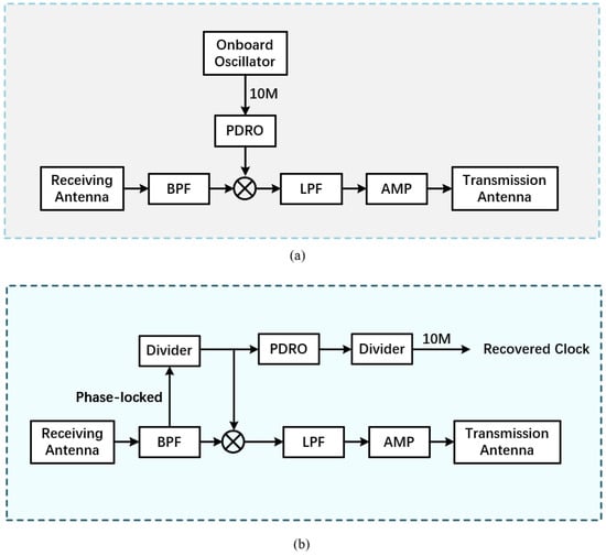 As Figure 1a shows, the onboard oscillator’s frequency and phase are included in the signal returned to the ground. Consequently, the received signal always contains this unknown variable, i.e., conventional onboard single-conversion transponders introduce additional transmission errors caused by phase jitter and variations in the onboard local oscillator. As Figure 1b shows, this problem can be solved by a phase-locked frequency conversion method, by which the phases of the uplink and downlink signals are always locked. Once the signal traverses the bandpass filter (BPF), after undergoing a frequency division process, one of the signal paths is selected as the reference for the phase-locked dielectric resonator oscillator (PDRO). The resulting PDRO output is then mixed with the other path of the original signal and filtered using a low-pass filter to generate the down-converted signal transmitted to the ground station. Concurrently, following the frequency division, the 10 MHz or 100 MHz signal generated by the PDRO output serves as the recovered frequency standard from the ground station to the satellite and from there is provided to other systems.