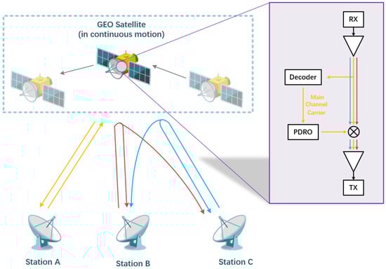 Figure 2 illustrates the architectural framework of the frequency transfer system based on the proposed GEO communication satellite’s phase-locked transponder. The on-orbit payload is servo-controlled and tracked by the main channel over an extended period, with its corresponding ground station, labeled as Station A in the figure, equipped with an ultrahigh-precision atomic frequency standard. A two-way link is established between Station A and the satellite to measure the phase variations across the entire link, evaluated at the carrier signal’s phase scale. Using real-time detection, the phase variations in the uplink and downlink are compensated separately to reproduce the terrestrial high-precision atomic frequency standard of Station A on the satellite. The down-converted PDRO of the phase-locked transponder is locked to and reproduces the frequency standard of Station A in real-time. Consequently, any other ground stations within the satellite’s coverage area can utilize the proposed transponder as a single conversion transponder without requiring modifications to existing applications. Furthermore, this method supports using any other ground station within the GEO satellite’s coverage area equipped with an atomic clock as the main channel, offering significant flexibility and scalability.