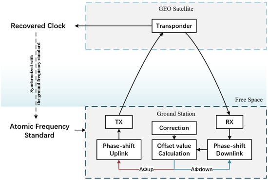 Satellites equipped with atomic clocks predominantly support navigation satellites, whereas commercial geostationary Earth orbit (GEO) communication satellites typically do not employ atomic clocks. Such satellites are increasingly being utilized as relays for time and frequency synchronization applications through free-space links [19,20]. Nevertheless, existing time–frequency transfer methodologies based on commercial GEO communication satellites face technical challenges stemming from their onboard crystal oscillators [21]. For instance, in satellite two-way time and frequency transfer (TWSTFT)—a critical contribution to realizing Coordinated Universal Time (UTC)—phase jitter in the local oscillators of GEO satellite transponders induces signal phase noise during transmission. This jitter compromises the precision of high-precision carrier-phase measurements [22]. In timing and positioning applications of the Chinese Area Positioning System (CAPS), the limited accuracy and long-term stability of hybrid frequency sources onboard the GEO satellites can adversely affect the stability of downlink carrier frequencies, thereby degrading positioning precision [23,24]. Regarding our prior work on the Einstein two-way frequency synchronization (SESAR) method [25], the phase drift introduced by the transponder’s local oscillators disrupts the phase coherence between uplink and downlink signals, constraining further improvements to frequency comparison accuracy. Even when substituting the crystal oscillators with chip-scale atomic clocks [26], their long-term stability remains limited to the order of 10−12, whereas the daily stability levels of TWSTFT or the SESAR method have already achieved 10−15. This performance gap evidently inhibits emerging high-precision applications.