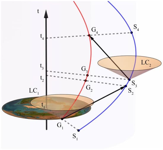 Figure 4 shows the schematic of the bidirectional information exchange between a satellite and a ground station. The ground station antenna’s position vector, projected onto the equatorial plane, interacts dynamically with the Earth’s rotation and the satellite’s synchronized orbit. In the Minkowski spacetime, this creates equidistant spirals, denoted as G (ground station) and S (satellite).