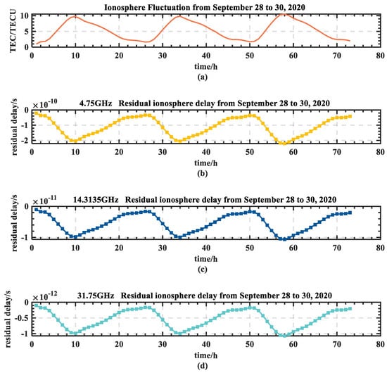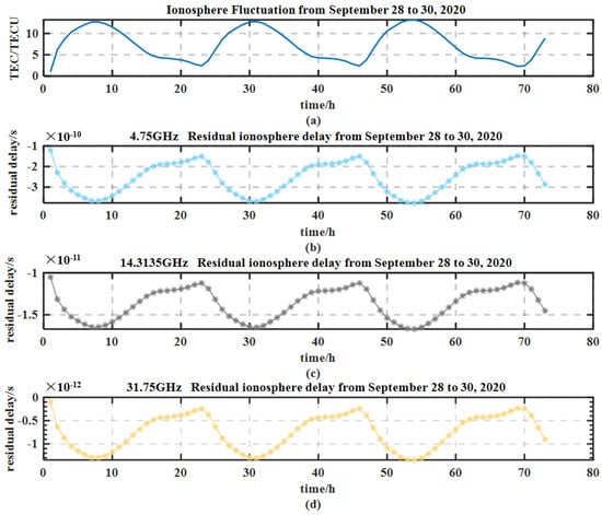 Residual time delays of the signals reproduced on the satellites in the three bands. (a) The electron content (TEC) of the Xi’an ionosphere fluctuated over three days. (b) Uplink C-band (4.75 GHz), downlink S-band (3 GHz). (c) Uplink Ku-band (14.3135 GHz), downlink Ku-band (12.5635 GHz). (d) Uplink Ka-band (31.75 GHz), downlink Ka-band (30 GHz).