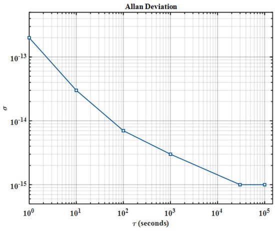 A prevalent approach to enhance the performance of spaceborne time and frequency references is to use onboard atomic clocks. Over time, the number of satellites equipped with atomic clocks has increased considerably, particularly for navigational applications [9]. The performance of these onboard atomic clocks directly determines the accuracy of navigational and positioning systems and is crucial for their precision and stability [10,11,12]. Navigation satellites, such as the Global Positioning System (GPS), GLONASS, BeiDou, and Galileo, are equipped with a cesium frequency standard (CFS), rubidium frequency standard (RFS), and passive hydrogen maser (PHM), which are fundamental to their time–frequency systems [13,14]. The stability of these frequency sources has been evaluated using the Allan variance, a statistical measure for assessing the stability of frequency sources. In this context, the frequency stability of the CFS on GLONASS R17 can reach 3 × 10−14 after averaging for approximately 16 h. The RFS on the GPS yields a 3 × 10−15 24 h frequency stability. The BeiDou PHM yields a 7 × 10−15 24 h frequency stability [15].