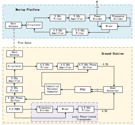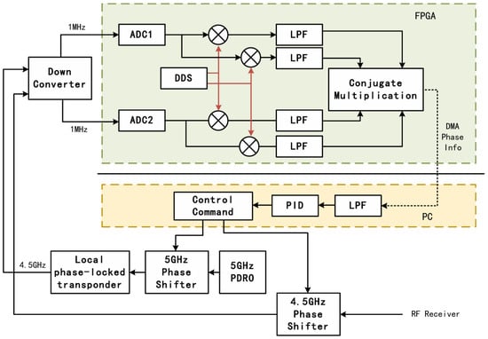 Considering the aforementioned analysis, the requisite compensation values for Equation (3) can be ascertained using Equation (1). Establishing a real-time active compensation system for the ground station carrier phase enables the phase difference between the transmitter and receiver to be detected after combining the correction values. The all-link phase difference can then be locked to 0 using uplink and downlink phase shifters. By denoting the compensation quantity as , after the system is locked to a steady state, we obtain the following equation: