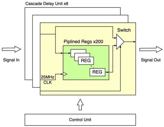 The architecture and implementation details of the Delay Line module are illustrated in Figure 10. This module consists of a series of cascaded shift registers, operating at a 25 MHz clock rate, to achieve precise and deterministic delay in the digital domain. Since the shift timing of the cascaded registers is entirely determined by the hydrogen maser reference, its accuracy is well ensured. Additionally, to facilitate adjustable delay values in subsequent experiments, each Delay Unit is externally accessible and controlled by a dedicated 8-bit memory cell. When a specific bit is set to 1, the corresponding delay unit is activated. Under ideal conditions, the Delay Line module is capable of introducing a tunable delay, ranging from 0 μs to 64 μs, with 8 μs step resolution.