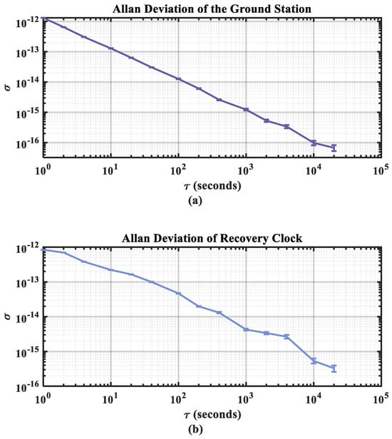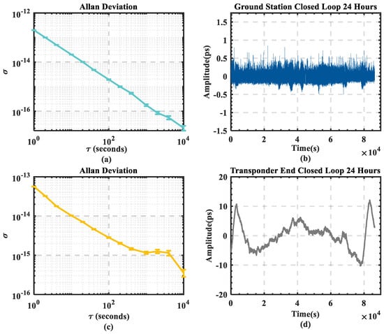 Figure 13 illustrates the closed-loop frequency stability of the dynamic experiment over a 48 h period. The calculations demonstrate that the ground station end’s 10,000 s stability reached 9.88 × 10−17, whereas the transponder end’s 10,000 s stability reached 3.36 × 10−16.