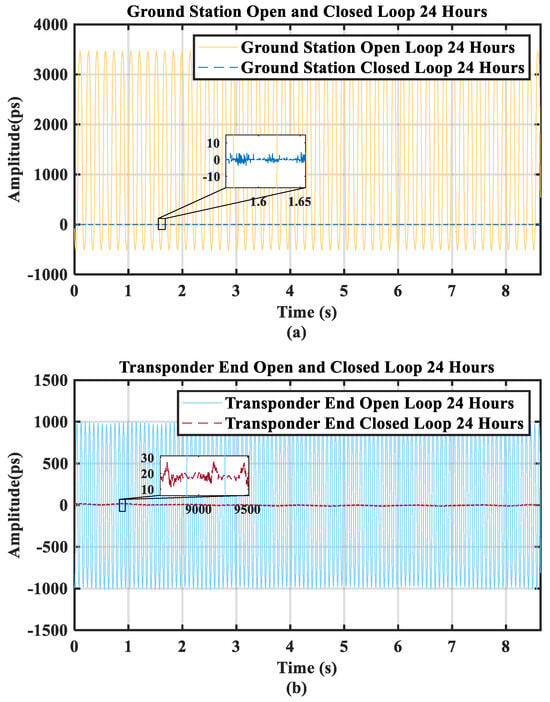 Figure 12b shows the time domain waveform and frequency stability of the remaining phase at the transponder end after proportional compensation. A comparison of the standard deviation of the phase difference converted to time before and after compensation reveals a considerable improvement, with values of 796.02 ps for the open loop and 6.33 ps for the closed loop.