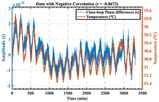 Notably, the ambient temperature in the vicinity of the RF device significantly correlated with the time-varying experimental results at the transponder end. Figure 14 illustrates the temperature fluctuations in the vicinity of the device throughout the experiment and depicts a comparison between the variations in temperature and the phase fluctuations of the recovered clock at the transponder side. The maximum Pearson product moment correlation coefficient (r) was −0.87, indicative of a strong correlation between the two variables.