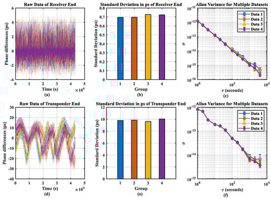 Regarding the transponder end, Figure 11, panels (c) and (d), respectively, show the frequency stability and time domain waveform of the remaining phase after proportional compensation. Although this method does not have a closed-loop structure for the uplink, as predicted by our theory, the time difference after compensation remained minimal. The peak-to-peak value was approximately 22.36 ps, and the standard deviation was 4.44 ps, as determined by statistical analysis. The system demonstrated short- and long-term stability, with 5.66 × 10−14 at 1 s and 3.56 × 10−16 at 10,000 s.