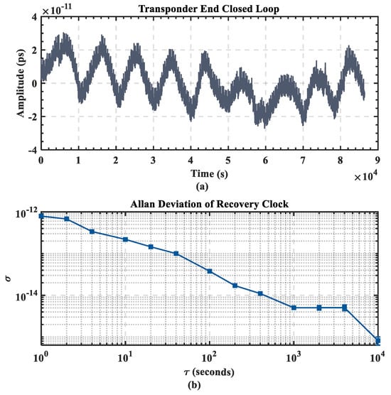 Figure 16a depicts the time domain waveform and frequency stability of the remaining phase at the transponder end after proportional compensation. The standard deviation of the phase difference were 9.73 ps for the closed loop. Figure 16b illustrates the closed-loop frequency stability of the dynamic experiment over a 24 h period. The calculations demonstrate that the transponder end’s 10,000 s stability reached 8.22 × 10−16. The experimental results are primarily influenced by fluctuations in room temperature, with minimal difference observed in the clock recovery performance before and after the equivalence.