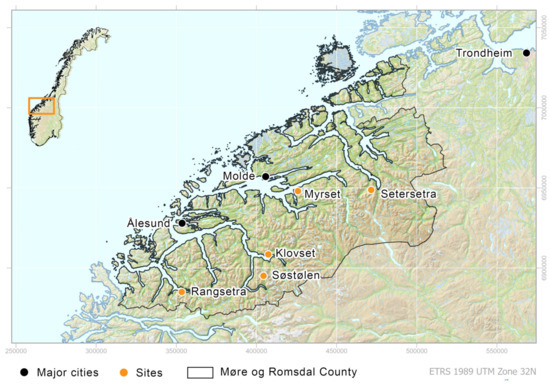 We have examined a selection of five shielings across the county of Møre and Romsdal, Norway, with varying topography, geology, and vegetation cover (Figure 1). Across the region, metamorphic gneiss is the dominating parent material. Drift geology varies, but glacial moraine deposits dominate most of the shieling sites [13]. Furthermore, none of the selected sites are densely forested, and for purely practical reasons, all the sites are located close to nearby roads. The main criterion is that they all contain archaeological remains dated between the Migration Period and the High Middle Ages (AD 400–1350), mainly documented by test pitting and small keyhole excavations.