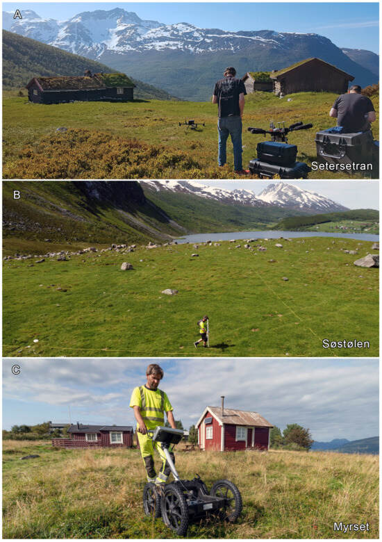 Photos taken during data collection; (A) Operating UAVs at Setersetran. To the left, a DJI Matrice 300 with a mounted RGB. To the right, a DJI Matrice 600 Pro drone with a Riegl MiniVUX 3 system; (B) Gradiometer survey at Søstølen, using a Bartington Grad 601 system with two Fluxgate gradiometer sensors; (C) GPR Survey at Myrset, using a Malå 450 Mhz antenna. Photos by Kristoffer Dahle and Magnar Fjørtoft, Møre and Romsdal county.