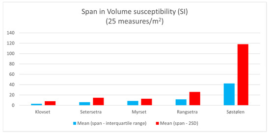 A measure that may capture varying terrain surface properties, i.e., whether the ground was smooth or rough—consisting of homogenous grass and turf or a heterogenous mixture that includes stones, tussocks, and boggy spots—is the variation or span of the topsoil magnetic susceptibility measures (SI) per m2. Before excavating the 1 m × 3 m trial trenches, we ran a test by measuring MS every 0.25 m × 0.25 m within this smaller grid. Generally, the mean span per m2 and the number of outliers align with the subjective experience of the sites and their physical appearance. The range of these readings also impacts the uncertainty or randomness of the more extensive topsoil mapping conducted across the sites at lower resolution (5 m × 5 m). Søstølen may be an exception due to the extremely high MS values, which further influence the span (Table 2, Figure 4).