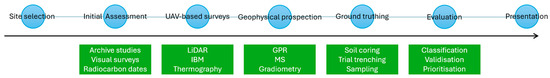 Non-invasive investigations were conducted in several rounds during the summer of 2022 (phase 1). In early June, with the vegetation still being low, we performed a three-day campaign using UAV-based survey methods (LiDAR, IBM, and thermography). Magnetic surveys (gradiometer and topsoil magnetic susceptibility) were mainly carried out in mid-to-late June, whereas the GPR surveys were conducted in early July and September. In cases where timing may affect dataset comparisons, this will be further detailed below.