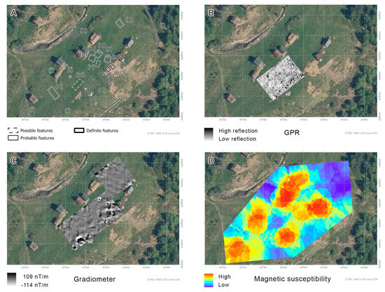 Collage from geophysical prospection at Klovset; (A) Overview of the features—with corresponding letters in the main text, (B) GPR, (C) Gradiometry, and (D) Magnetic susceptibility.