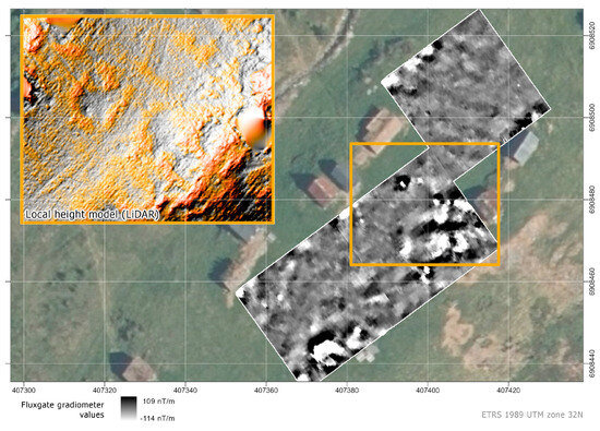Whereas magnetic susceptibility measurements mainly aim at identifying and delimiting sites or areas of interest [2], gradiometry is potentially more capable of detecting archaeological features. With a 0.5 m crossline spacing, however, one should not expect features less than 1m in diameter [2,57]. However, the credibility of magnetometry in shieling landscapes dominated by metamorphic bedrocks and glacial moraine deposits is low, as the archaeological features are ephemeral and hard to separate from randomly distributed magnetic rocks [2] (pp. 102–104). At some sites, such as Klovset, the location of the magnetic deviations in relation to features identified by other means helps substantiate their archaeological significance. The same applies to Setersetran and Myrset, where magnetic contrasts could be correlated to more recent house foundations partly visible above ground. Elsewhere, the datasets were too noisy to be readily interpreted within an archaeological survey context.