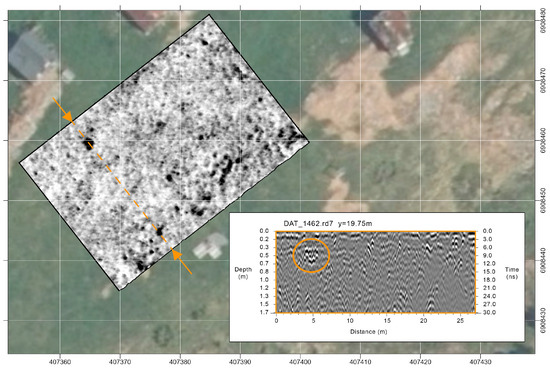 The collected datasets were processed in GPR Slice using T0-correction, bandpass filtering, background removal, and migration, in that order. The interpolation was carried out by kriging, and the program also allows for direct profile and slice correlations in 3D. The grids were georeferenced in ArcGIS Pro based on precise CPOS GNSS measures from every corner and from orthophotos created using UAVs.