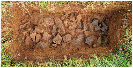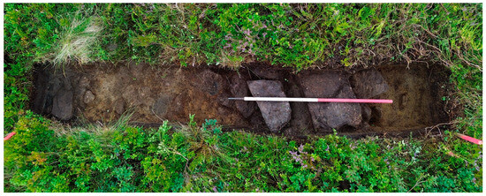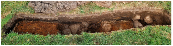 In addition to opening a small trench to verify the possible cooking pit (t) revealed by the GPR prospection, trial trenches were placed across two possible house foundations (u and m). Both were placed within the areas with identified archaeological deposits. The first trench (T1) soon reached a compact layer of fire-cracked stone. It did not contain charcoal, and rather than a cooking pit, it appeared as merely a pit of loose, fire-cracked stones (Figure 11). The second trench (T2) was placed across the wall of a possible house foundation (u), identified by GPR as two perpendicular walls in the corner of the grid. Both walls were recovered in the 0.5 m × 3 m trench, as one of them happened to follow the southern section. The opposite section displayed stratified deposits, and a sample from a charcoal layer that went underneath the wall was dated to AD 677–818 (1260 ± 13 BP, TRa-21646). Below, there was an even older archaeological deposit, containing a lump of iron slag.