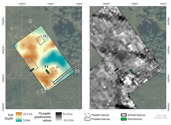 The gradiometer survey was conducted in three 30 m × 30 m grids in open areas between the buildings and projecting rock outcrops (Figure 8). The rock formations dominated the dataset, exhibiting strong dipolar readings with an irregular shape. However, two dipolar features (q–r) spatially related to the two depressions visible in the IBM and LiDAR datasets (m–n) are interpreted as anthropogenic features. There may also be other features (s), but they are hard to discern from erratic magnetic rocks close to the surface.