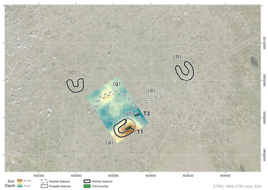 After the initial detection, however, this study has exhibited the potential for non-invasive technologies to elaborate on archaeological features and the physical content of the registered sites. In addition to mere research purposes, this could contribute to adjusting planned development and, if possible, avoid conflict with subsurface features not detected by coring. If not, non-invasive investigations may also help prepare and budget for a final rescue excavation. As the subterranean remnants at the shieling sites are somewhat ephemeral, and neither features nor archaeological deposits are covered by 30 cm of topsoil, excavations by machine have often failed to realise the potential of these early transhumant sites—throwing the baby out with the bathwater [11] (p. 55). Better knowledge in advance may thus contribute to more targeted excavations. We hope that this study may exhibit the potential and limitations of varying methods and combinations at the shieling sites, in various terrains and environments, and under various circumstances.