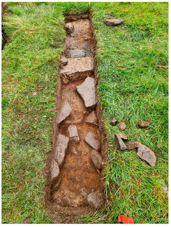 One half of each trench was stratigraphically excavated, reserving the other half for sampling. In cases of thicker strata, the soil was uncovered in 5 cm slices. Small stones were removed, while larger stones—potentially part of walls or other anthropogenic features—were left in place. Artefacts were collected, but no sieving was carried out due to low expectations. Because the utensils used in the shielings were mainly wooden, the sites rarely contain any preserved artefacts [7,48].
