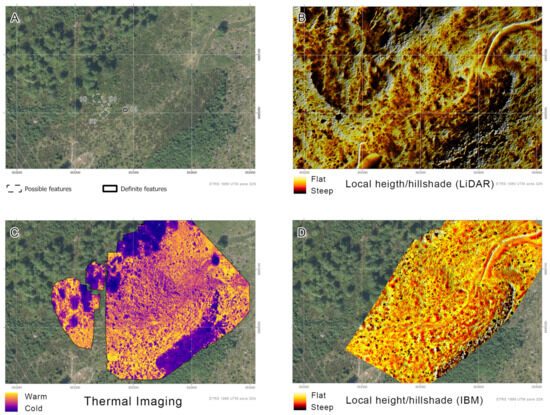 Collage from aerial surveys at Klovset; (A) Overview of the features—with corresponding letters in the main text, (B) LiDAR, (C) Thermography and (D) Image-based modelling.