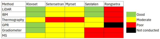 Naturally, operating aerial surveys is less dependent on terrain properties. As none of the sites were densely forested, the practical conditions and applicability were fairly similar across all five sites. LiDAR data from the sites was collected in a few minutes but extended to cover more significant portions of the surrounding landscape. The use of the UAV with cameras was somewhat more time-consuming, although it still proved that entire shielings could be surveyed within half a day. However, UAVs depend on battery capacity, favourable weather conditions, and, for the thermal camera, even on solar conditions and the time of day. The conditions were generally good for geophysical prospection, with mostly dry weather during and prior to the investigations.