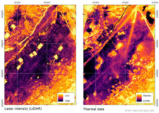 Simultaneously, as the aforementioned RGB images were taken, the UAV-mounted camera photographed thermal images (Figure 3A). These images have a resolution of only 650 × 512 pixels, requiring flights to be conducted at a low altitude with a high degree of overlap. Thermal imagery, or thermography, captures the infrared radiation emitted by surfaces and converts it into a visual representation called a thermogram. The technique originated in the 1920s, but the production of real-time thermal imaging systems was made possible by advancements in detector technology and signal processing in the mid-20th century [30] (pp. 1–24). Because of its non-destructive potential to discover hidden archaeological features by detecting variations in surface temperatures, thermography has emerged as a valuable tool for archaeology. For instance, the technique has been used for site prospection, mapping of ancient structures, and monitoring of environmental changes affecting archaeological sites [31,32].