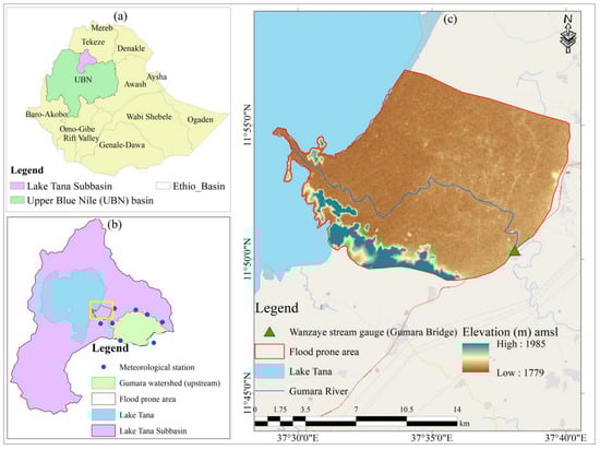Location map of the study area. (a) The Upper Blue Nile (UBN) Basin and the Lake Tana sub-basin within the context of Ethiopia’s 12 river basins, (b) the Gumara watershed in the context of the Lake Tana sub-basin, and (c) detailed features of the study area, including the streamflow gauging station, flood-prone area, Gumara River (downstream section), and elevation map. The yellow box in subfigure (b) highlights the flood prone area.