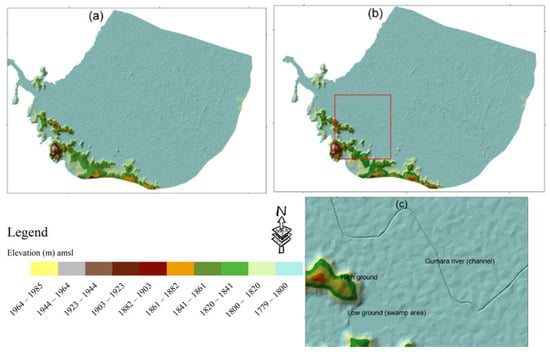 Terrain modification in triangular irregular (TIN) format. (a) Original terrain model, (b) modified terrain model, and (c) details of the modified terrain model showing the Gumara River (channel) and elevation variation in the floodplain area found at the left bank of the river. The red box shows a snapshot of the floodplain area detailed in (c).