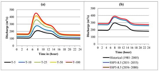 (a) inflow hydrographs for different return periods (5, 10, 25, 50, and 100 years) and (b) inflow hydrographs for the extreme conditions of the historical (1981–2005), near-future (2031–2055), and far-future (2056–2080) periods based on the SSP5-8.5 high-emission scenario [48].