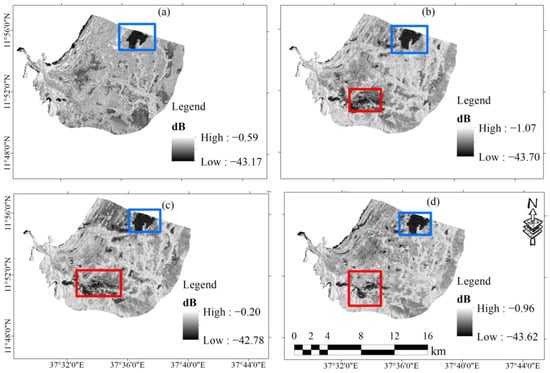Flood inundation mapping was conducted via SAR images acquired before and after the flood, as detailed in the methods section. The preflood images were acquired before the flood event and served as a reference, whereas the postflood images were acquired during or after the flood event and used to map areas inundated by floodwater. A composite of SAR images from 11 and 23 January 2019 was used to capture the preflood conditions of the area (Figure 7a). These images were selected because January is typically a dry month in the study area. SAR images for 22 July, 3 August, and 27 August 2019 (Figure 7b–d, respectively) were used to delineate flood inundation on those dates. These specific images were chosen on the basis of the availability of SAR data for the given dates and to analyze the initiation, progression, and recession of floodwaters in the study area. All the images were processed through automated preprocessing steps in the GEE environment, and speckle filtering was applied via the Lee filter [49] to reduce noise (speckles) in the images.