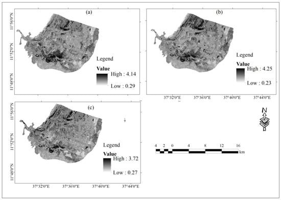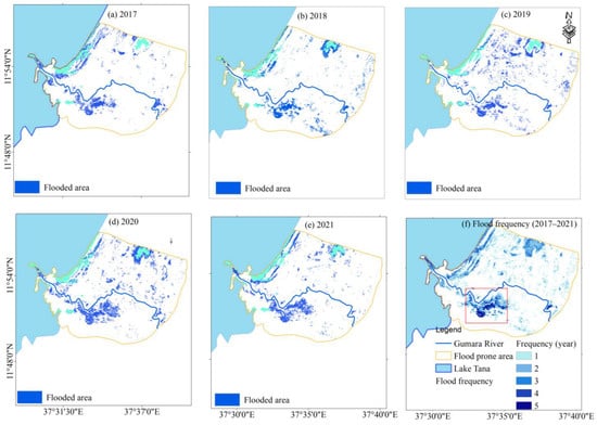 A similar procedure was followed for importing and filtering SAR images from 2017–2021. Time series inundation maps were prepared via composites of January images as preflood conditions and composites of July–August images as postflood conditions instead of focusing on specific flood events. This approach aimed to map flood frequency in the region over a five-year period.