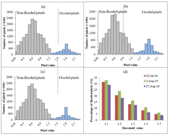 Furthermore, the percentage area of flooded pixels was also computed to analyze the sensitivity of the flood extent to different threshold values, which could guide the determination of the optimal threshold value. Following these methods, the optimal threshold was determined for separating flooded pixels from nonflooded pixels.