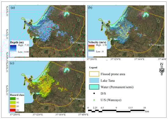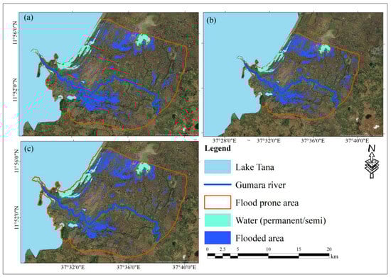 Floods are the most frequent and widespread climate-related hazards, causing significant environmental destruction [1,2,3]. In Ethiopia, frequent and severe floods triggered by extreme rainfall events have become a major concern across various parts of the country [4,5,6,7]. According to the 2019 flood report by the United Nations Office for the Coordination of Humanitarian Affairs (OCHA) [8], floods affected more than 570,000 people in various regions of Ethiopia in 2019. In Ethiopia, the majority of flood events occur due to unseasonal and prolonged extreme rainfall events, which have a negative impact on sustainable socioeconomic development. To reduce potential future flood damage, assessing community exposure, infrastructure vulnerability, and agricultural crop loss is important. For this purpose, flood inundation maps and frequency information are crucial for providing flood alert information [9].