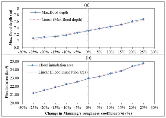 Sensitivity analysis is an essential step in evaluating how variations in input parameters influence model outputs [63]. It is typically measured as the positive or negative percentage change in model output relative to a reference scenario. In this study, the sensitivities of flood depth and inundation area were analyzed with respect to changes in Manning’s roughness coefficient (). The analysis was performed by systematically increasing/decreasing the reference Manning’s from −25% to 25% at 5% intervals following a similar procedure to the one provided in Ghimire et al. [64]. The resulting changes in flood depth and inundation area were computed relative to the results obtained via the baseline Manning’s value. The baseline Manning’s values were determined on the basis of the average of the upper and lower bounds provided for different land use and river channel types by Chow [61]. The percentage changes in flood depth and inundation area were calculated as follows:
