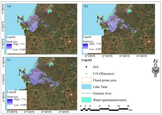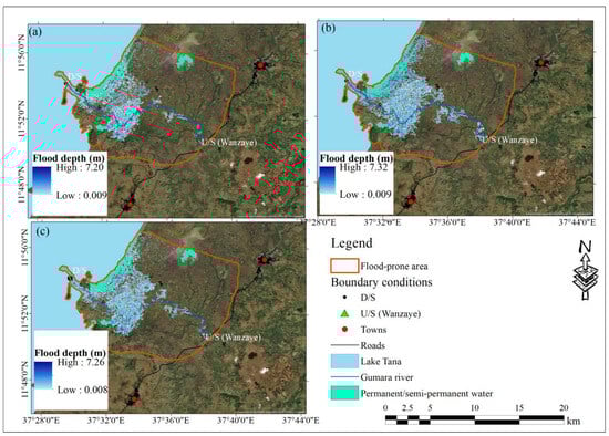 The observed daily time series discharge data (1981–2019) for the Gumara River at the Wanzaye gauging station were collected from the Ministry of Water and Energy (MoWE) of Ethiopia. These data served as the upstream boundary conditions for simulating the observed flood event. Additionally, daily observed rainfall data (1981–2019) were obtained from the Ethiopian Meteorological Institute (EMI). Inflow hydrographs of the upstream Gumara watershed for various return periods (5, 10, 25, 50, and 100 years), as well as for extreme conditions during the historical (1981–2005), near-future (2031–2055), and far-future (2056–2080) periods, were sourced from Belay et al. [48] and used as boundary conditions. In Belay et al. [48], these inflow hydrographs for the upstream watershed were generated by counting future extreme rainfall and projected LULC data for the years 2035 and 2065.