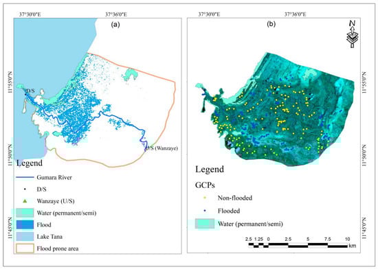 The downstream area of the Gumara watershed (study area) is one of the most frequently flood-affected areas in the Upper Blue Nile (UBN) Basin of Ethiopia [40]. Floods in this area cause the destruction of infrastructure, the inundation of agricultural lands, and the disruption of socioeconomic activities [41,42]. Factors such as extreme rainfall, land use and land cover (LULC) changes, and topographic and drainage characteristics contribute to the increased risk of flooding in this area. In this area, studies have been conducted using the HEC-RAS model [43] and Sentinel-1 SAR images based on a histogram-based thresholding approach [40]. However, flood inundation mapping under changing LULC and climate conditions and rapid flood mapping via Sentinel-1 SAR images via the change detection approach have not been fully investigated in the studied watershed.
