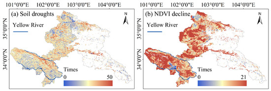 Occurrence of abnormal events. (a) Occurrence of soil drought events; (b) Occurrence of abnormal NDVI decline events. The blank areas are non-grassland areas and areas without sufficient data for calculation.