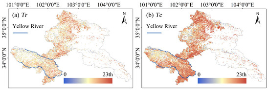 The comparison of model fitting demonstrated that exponential functions outperformed (higher R2) linear models across 70.08% pixels with sufficient observational data (Supplementary Figure S2), indicating prevalent nonlinear responses of alpine grassland to intensifying drought stress. The rapid resistance loss threshold Tr had a mean value of 8.93th, with low values clustered in western alpine shrub meadows and sparse vegetation zones with high elevation, whereas riparian zones and alpine wetlands showed higher thresholds (Figure 1 and Figure 3a). Similarly distributed, the complete resistance loss threshold Tc averaged at 7.36th. The northern alpine steppes had comparatively higher Tc values relative to alpine meadows and shrub meadows (Figure 1 and Figure 3b). Geographically, southern regions—particularly alpine meadows and shrub meadows in Figure 1—had higher Tc thresholds than the north. Collectively, these patterns indicate the vulnerability of Gannan’s alpine grasslands, where minor soil moisture deficits triggered rapid ecosystem resistance degradation. The narrow threshold interval between two thresholds further suggests accelerated resistance depletion post–initial drought triggering.