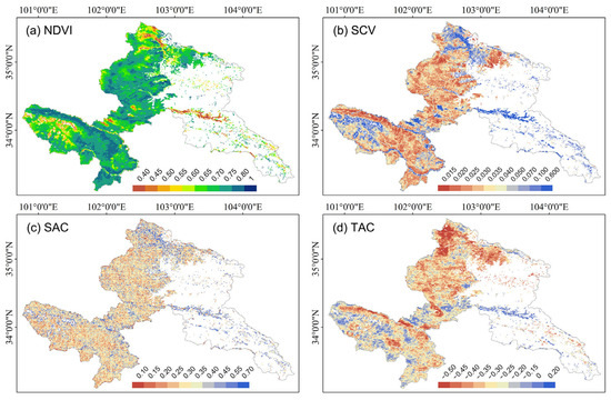 Temporal trends (slope) of NDVI and spatiotemporal indicators of Gannan alpine grassland. (a) NDVI; (b) Spatial variance (SCV); (c) Spatial autocorrelation (SAC); (d) Temporal autocorrelation (TAC). The blank areas are non-grassland areas and areas without sufficient data for calculation.